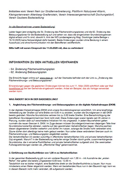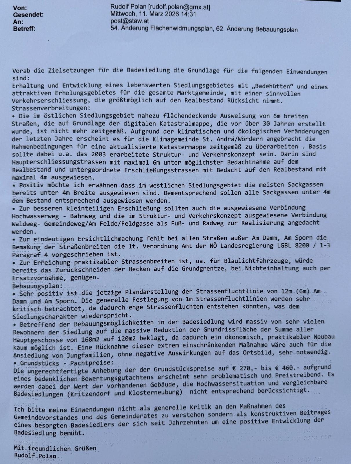 Vorbereitung auf Beratungstreffen Rechtsanwalt Michael Mendel am 16.3.2026 4.3.2026 Besprechung mit BGM Kittinger und VizeBGM Hammer Sitzungsprotokoll Dr. Klauser Einsprüche von Experten Experteneinspruch Kathi Puxbaum Experteneinspruch Rudi Polan Einwendung Dr. Klauser Sirzungsprotokolle aus vergangen Zeiten Sitzungsprotokoll 2001 Stellungnahmen von Behörden Stellungnahme Abteilung Bau- und Raumordnungsrecht des Landes NÖ Aushang https://www.staw.at/54_Aenderung_oertliches_Raumordnungsprogramm_Kundmachung Mustervorlagen Unser Einwand, der als Mustervorlage verwendet werden kann als PDF Bearbeitbare Mustervorlage als Word Dokument